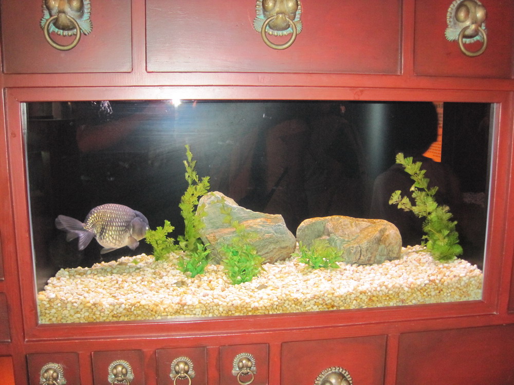 Beautiful combination between the art of woodcraft, glass, aquarium decoration, lighting, and goldfish. And also some ornaments like vase and goldfish images. I could see how passionate the person behind all these carefully thought designs.