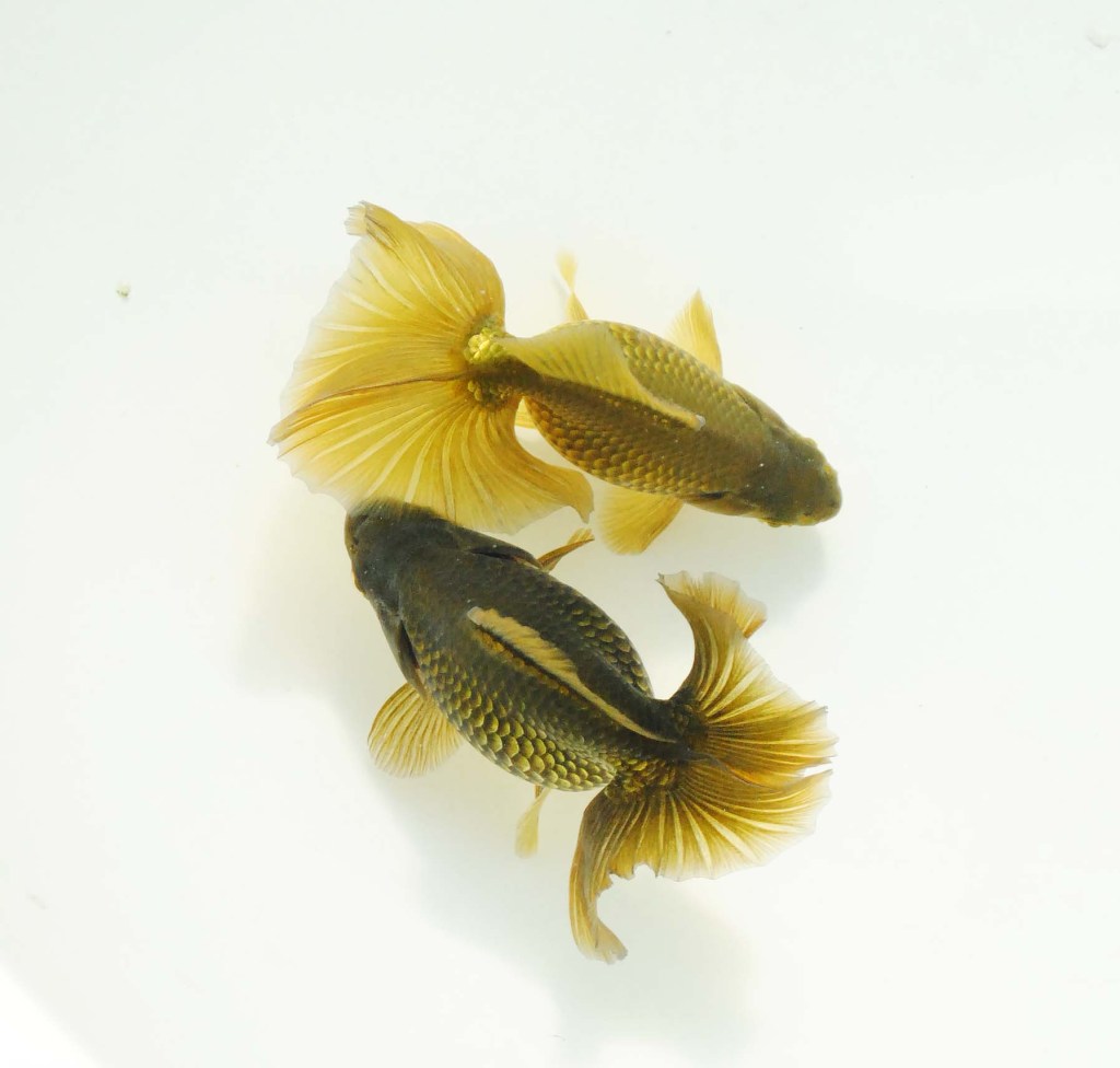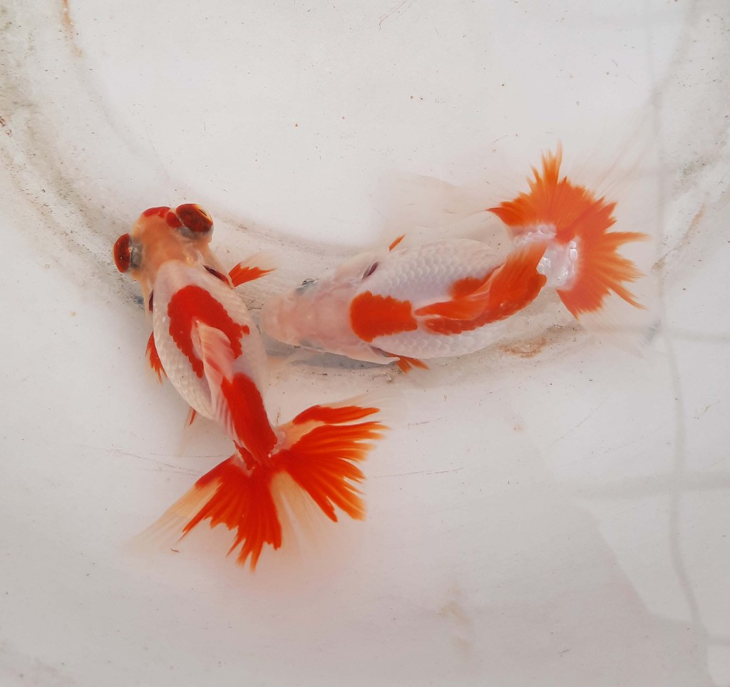 The second surprise is the appearance of a different kind of tosakin. The characterstics are a softer tail, but longer. And a better red color than the DBS line. I do not recall what crossing that produces them. I suspect the butterfly is responsible for this. There are two of them, both are male: