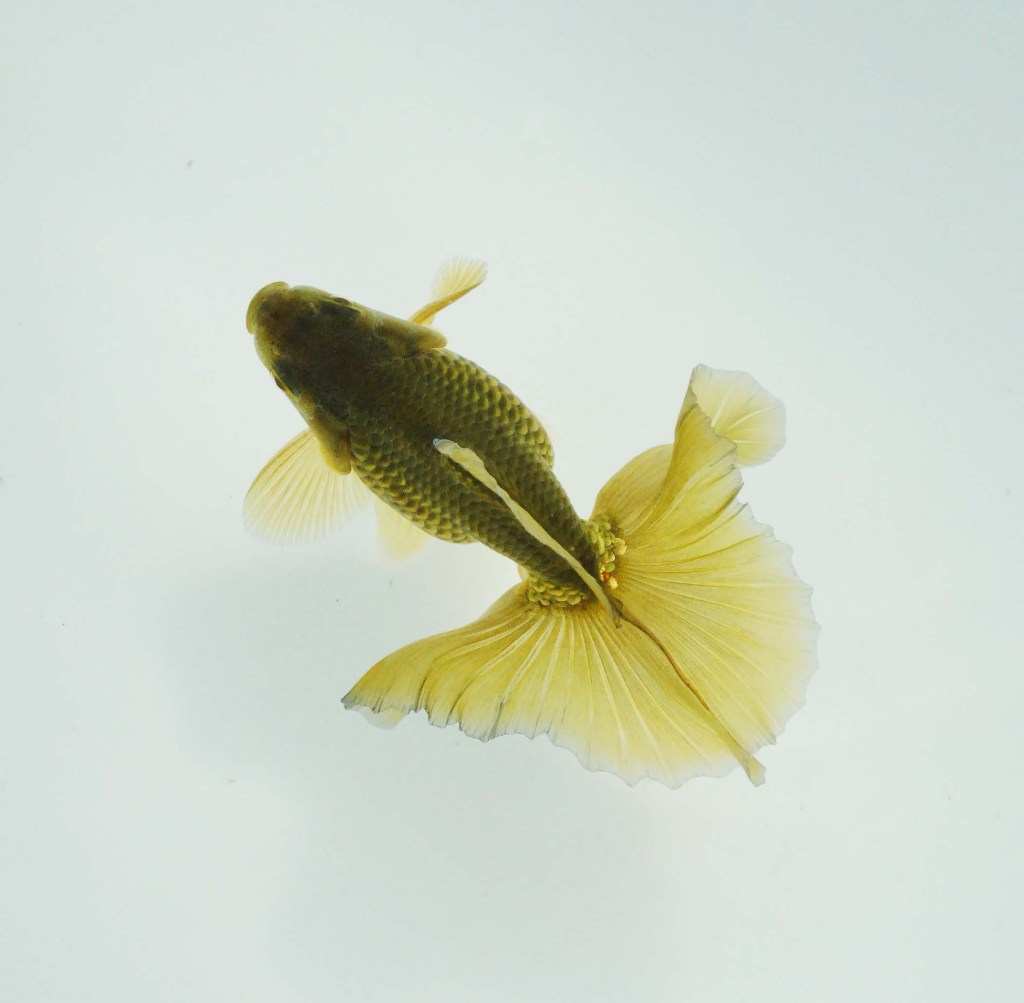 I think this type is the most faithful I have to the Tosakin tail standard. First, I am talking about the strength of the tail, or … I do not know the right terminology. Perhaps it is better to refer to it as the hardness of the tail. The tail does not collapse easily and can maintain its form well (its flips and its middle tail). Second, I have improved the middle tail shape a lot, from the V shape I had before to the horse-shoe shape right now. Third, the “thousand-rays” are visible. Fourth, the flips are clearly visible, of medium size, and always maintain its open position most of the time. I am satisfied with these improvements. The next improvement I am aiming at is to lengthen the tail size without sacrificing all the positive features I mention above. And one more good point of the fish is its thick backbone!