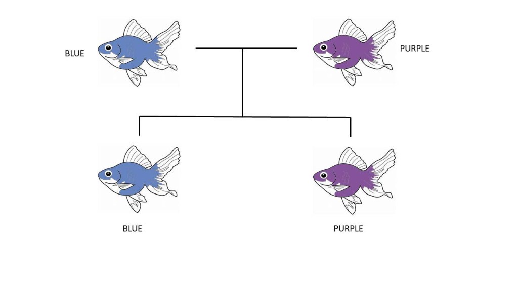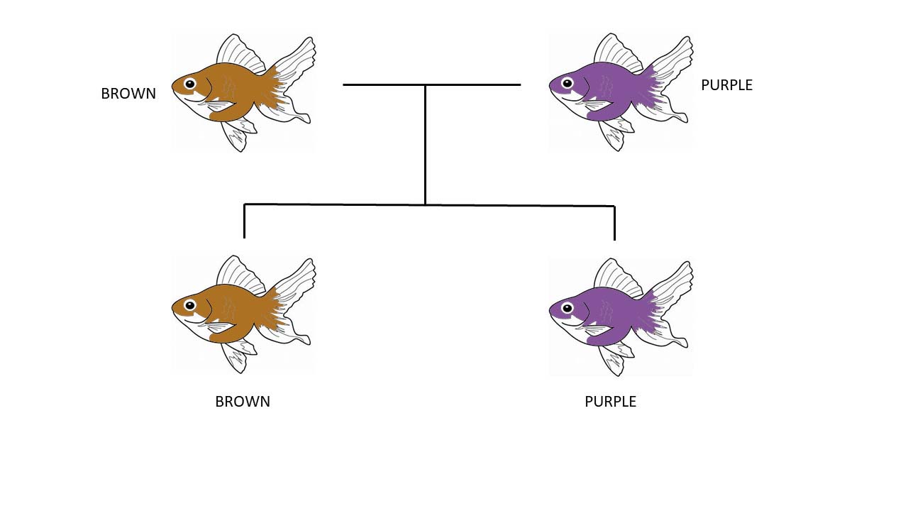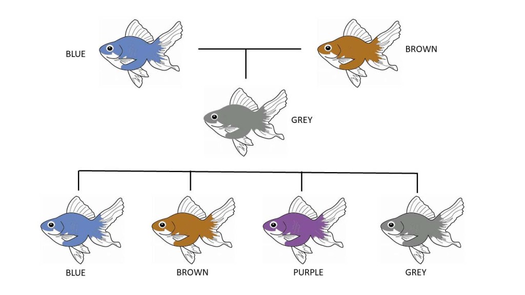 So, although the blue and brown are not related, the blue is somewhat related to the purple. The brown is also related to the purple. Here we see that the key is the purple goldfish. When we crossed the blue and purple, the result will be blue and purple right on the F1. The same case happen in the cross between brown and purple. We will immediately get brown and purple.